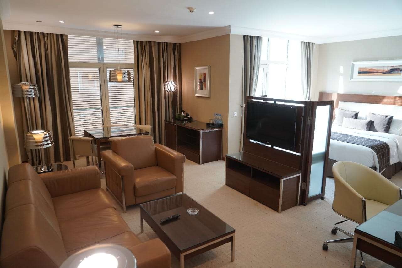 538 ft² Featuring palm garden view and modern décor, this spacious, air-conditioned suite measures 50 square meters in size and offers an elegant living area with a flat-screen TV, a tea/coffee maker and a minibar upon request. The bathroom is fitted with a bathtub and complimentary slippers.
